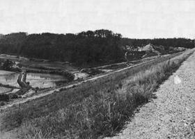 ![]() | ![]() | 昭和12年6月 既に完成した本堤防西側の天端から池の下流を撮影しています。 田には水が張られ田植えも終わっています。 これらの田は今はすべてなくなりグランドなどになっていますが、その奥の森は堺市の公園緑地になっているため、高圧線の鉄塔が建った以外はあまり景色は変わりません。 |